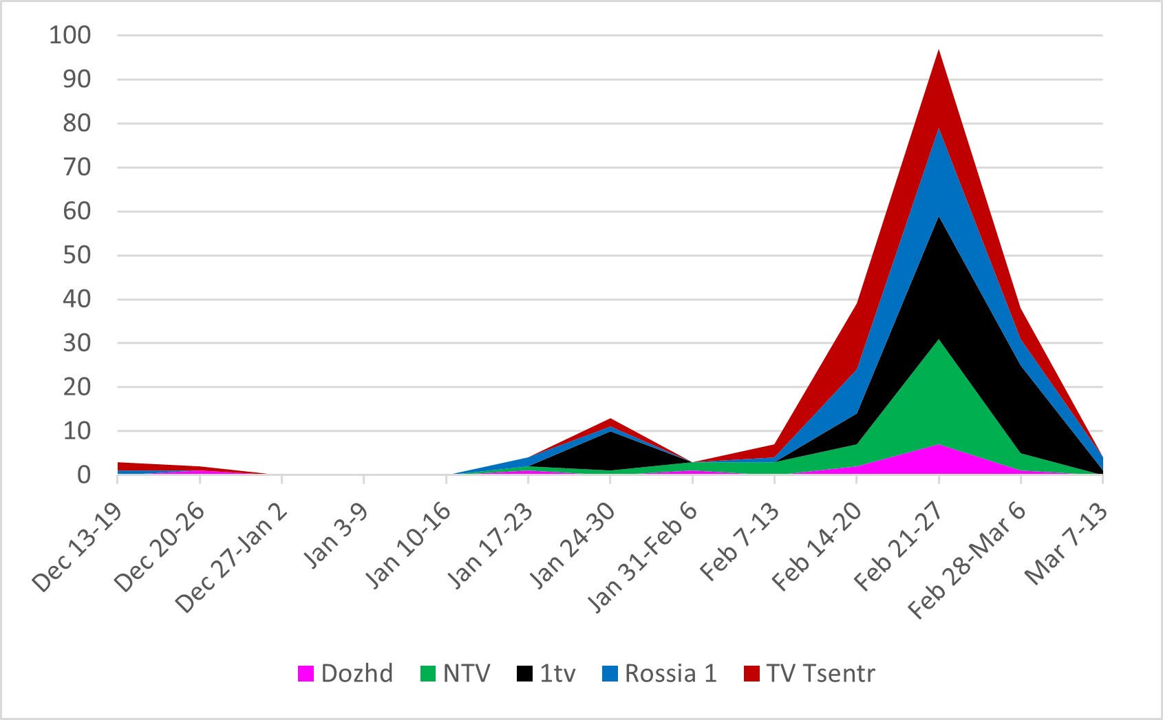 The data for this study are drawn from the Integrum Profi television broadcast transcripts, which were analyzed on a week-to-week basis from December 13, 2021 through March 13, 2022. The week of December 13 was chosen as a starting point just before Putin initiated a crisis in relations with Russia with the issuance of his ultimatums to the US and NATO, hence a coordinated media campaign in Russia might also be observed from this time. Five channels were chosen for analysis: the state-run channels Pervyi Kanal (1tv) and Rossiia 1, the pro-government NTV (owned by Gazprom Media), Moscow’s public television station TV Tsentr, and the independent Dozhd TV (which ceased operation on March 3, 2022).