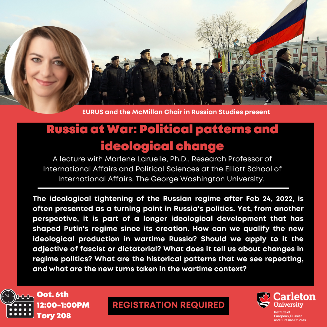 Join us for the lecture “Russia at War: Political patterns and ideological change” with guest lecturer Marlene Laruelle. The lecture is organized by the McMillan Chair in Russian Studies at the Institute of European, Russian and Eurasian Studies.