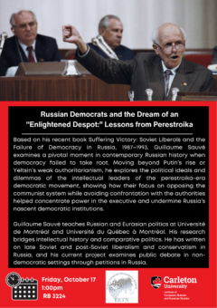 Guillaume Sauvé teaches Russian and Eurasian politics at Université de Montréal and Université du Québec à Montréal. His research bridges intellectual history and comparative politics. He has written on late Soviet and post-Soviet liberalism and conservatism in Russia, and his current project examines public debate in non-democratic settings through petitions in Russia.