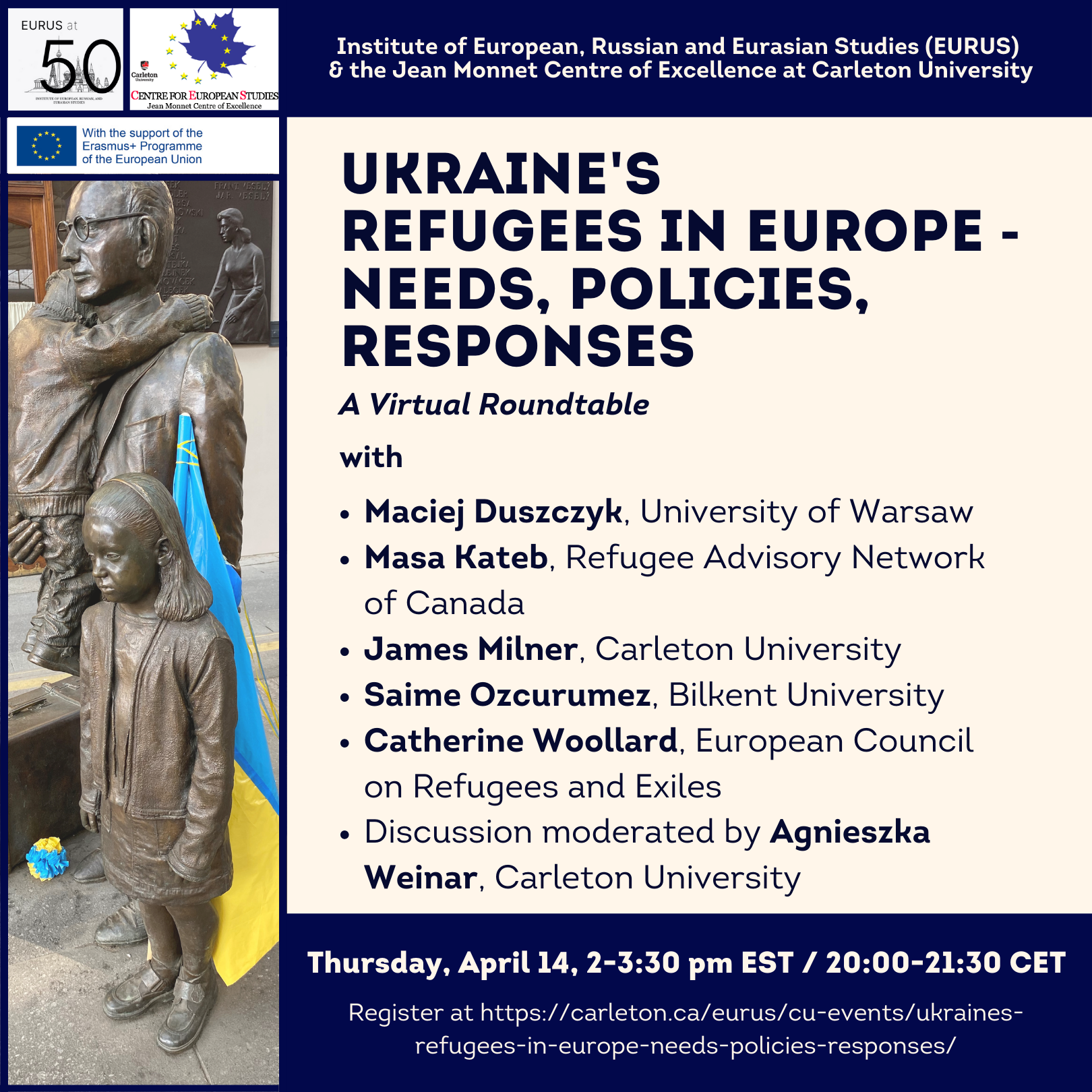 Since February 24, 2022, when the Russian invasion of Ukraine began, approximately 10 mil. Ukrainians have been displaced, with more than 4 mil. sheltering in the neighbouring European countries. According to the UN Refugee Agency (UNHCR) Commissioner, Filippo Grandi, this is “the fastest growing refugee crisis in Europe since World War II.” This roundtable brings together experts from Europe and Canada to discuss the current situation of Ukrainian refugees, the responses of the European Union and Canada to the ongoing humanitarian crisis, and possible lessons learned from other conflicts with recent mass migration. This event is hosted by the Institute of European, Russian and Eurasian Studies (EURUS) and the Jean Monnet Centre of Excellence at Carleton University.