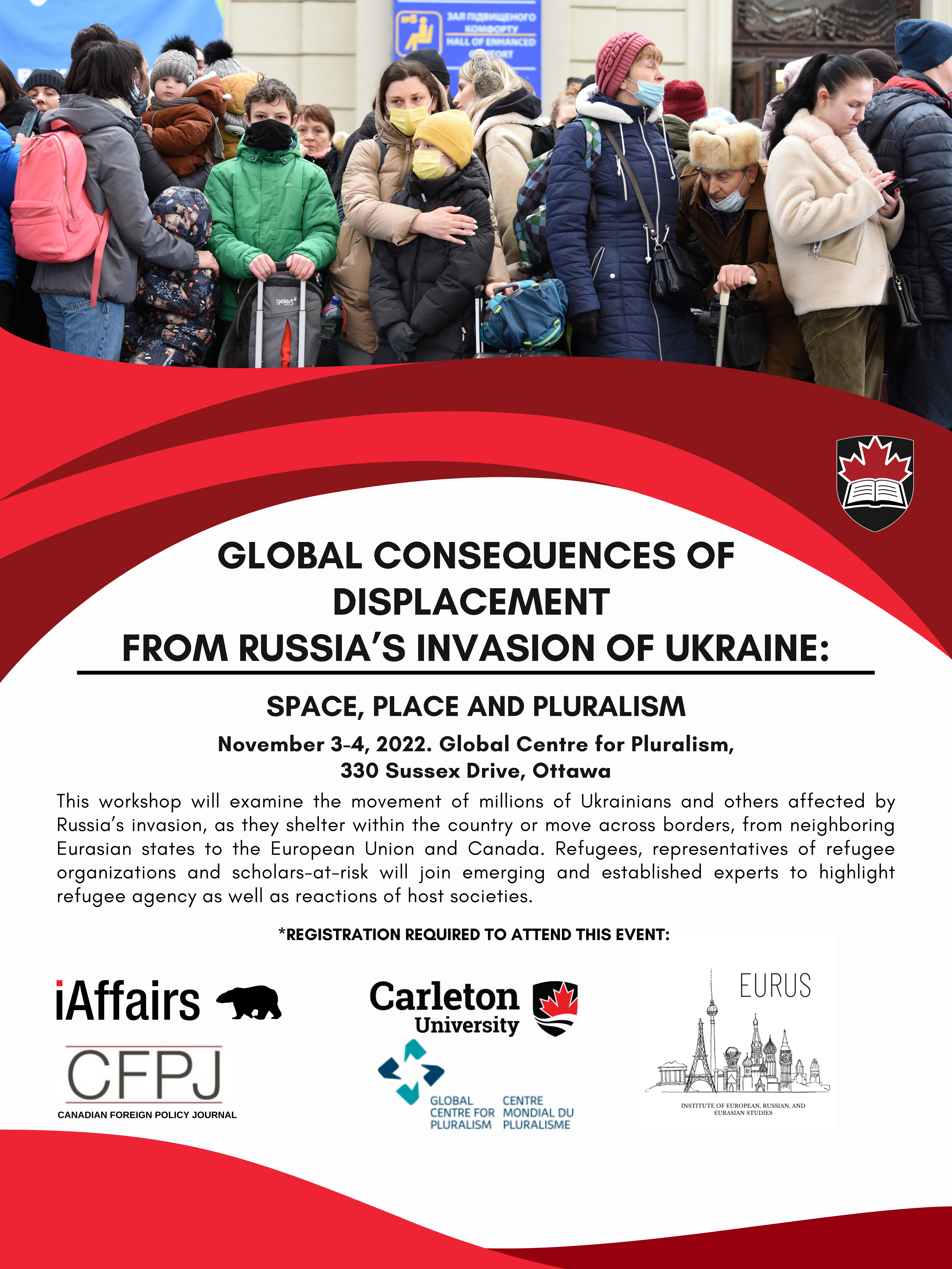 Please join us for the workshop “Global Consequences of Displacement from Russia’s Invasion of Ukraine: space, Place and Pluralism.” The event is organized by the Institute of European Studies at Carleton University, the Global Centre for Pluralism, the Canadian Foreign Policy Journal, and iAffairs. The workshop will take place on November 3rd from 8:45am-6:00pm, and November 4th from 8:45am-4:30pm. It will be in person at the the Global Centre for Pluralism, 330 Sussex Drive, Ottawa.