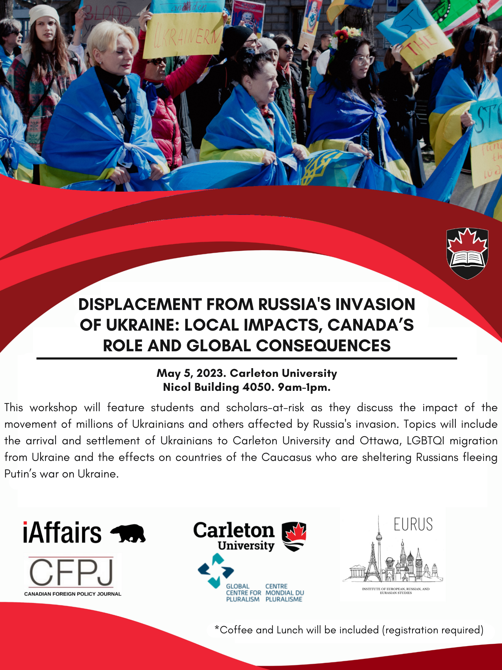 Please join us for the workshop: “Displacement from Russia’s Invasion of Ukraine: Local Impacts, Canada’s Role and Global Consequences.” The workshop features students and scholars-at-risk who will discuss the movement of millions of Ukrainians and others affected by Russia’s Invasion. The workshop consists of two panels, where speakers will present on a diverse range of topics, including the arrival and settlement of Ukrainians to Carleton University and Ottawa, LGBTQI migration from Ukraine, and the effects on countries of the Caucasus who are sheltering Russians fleeing Putin’s war on Ukraine.