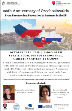 The Jean Monnet Centre of Excellence, Jean Monnet Chair in EU Relations with Russia and Eastern Neighborhood (EUREAST), the Embassy of the Czech Republic in Canada and the Embassy of the Slovak Republic in Ottawa, are very pleased to co-host, “100th Anniversary of Czechoslovakia: From Partners in a Federation to Partners in the EU.”