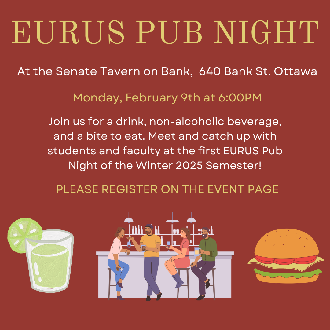 Join us for the first EURUS Pub Night of the Winter 2026 Semester! This is a great opportunity for the EURUS community to catch up with colleagues and friends over a drink, non-alcoholic beverage, and a bite to eat!