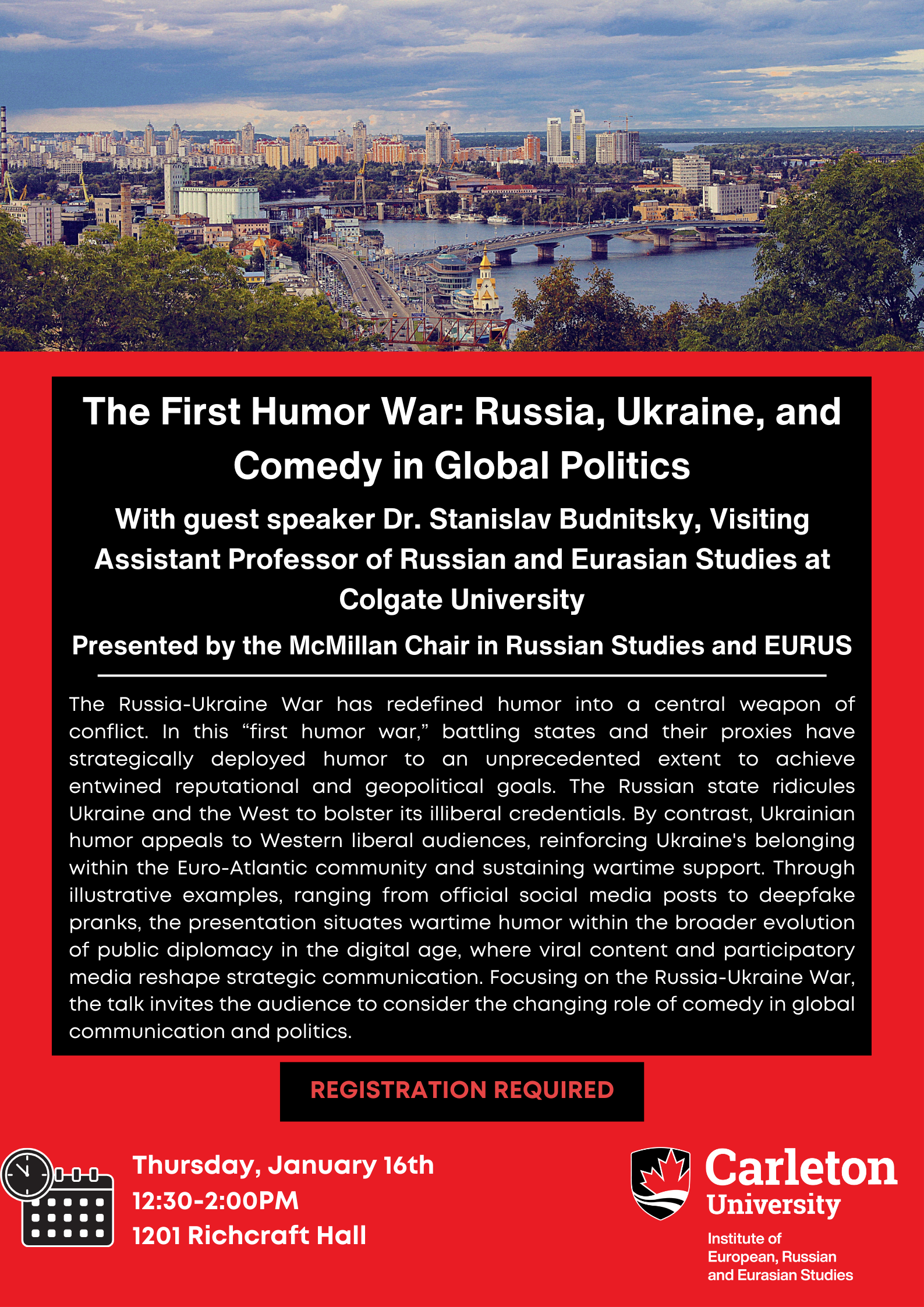 The event “The First Humor War: Russia, Ukraine, and Comedy in Global Politics”, with Dr. Stanislav Budnitsky, Visiting Assistant Professor of Russian and Eurasian Studies at Colgate University is sponsored by McMillan Chair in Russian Studies and SSHRC.