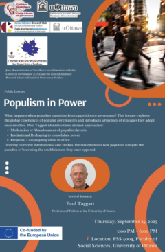 The Jean Monnet Centre of Excellence, in collaboration with the University of Ottawa’s Centre on Governance and the Konrad Adenauer Research Chair in Empirical Democracy Studies, will host a lecture, “Populism in Power”, with Paul Taggart, Professor of Politics at the University of Sussex, UK.