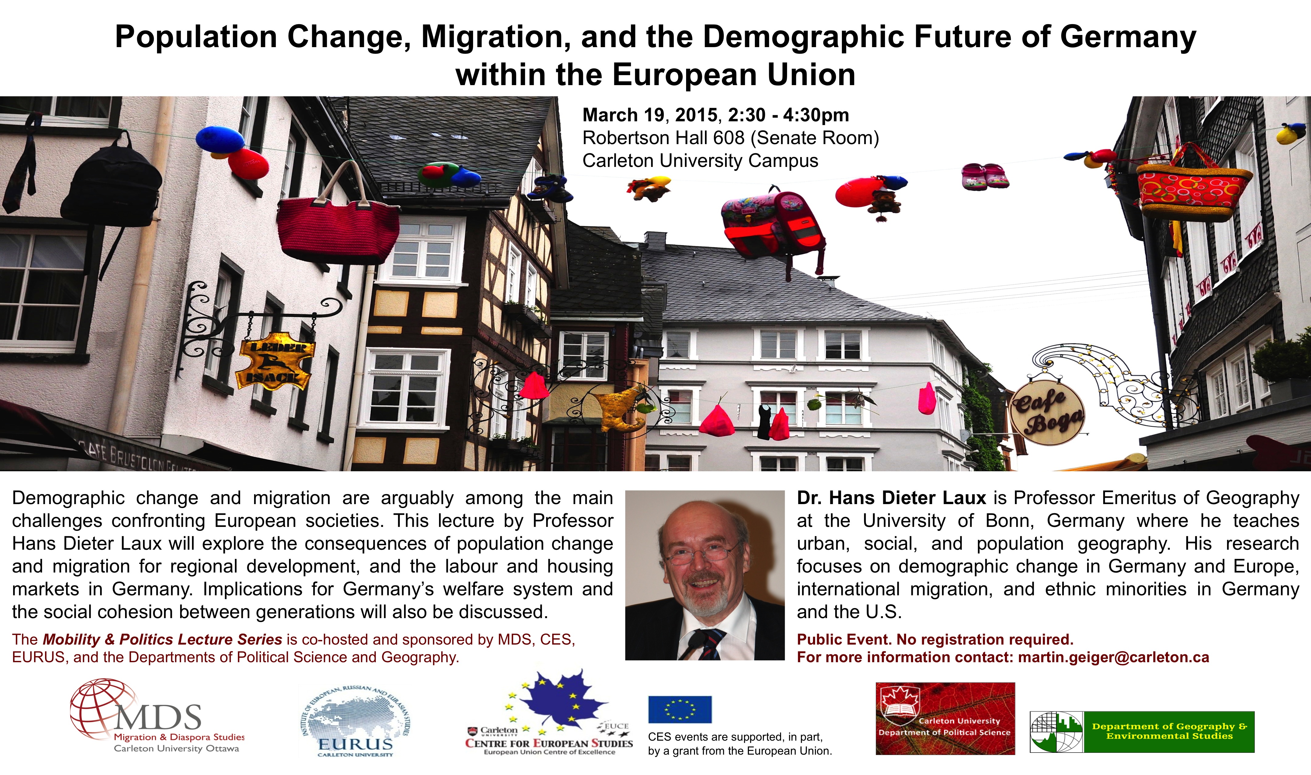 Please join us March 19th, 2015 for the first keynote speaker in our lecture series: Mobility & Politics: Emerging Trends and Common Challenges in Europe and Canada. Professor Dr. Hans Dieter Laux will present on “Population Change, Migration and the Demographic Future of Germany within the European Union”.