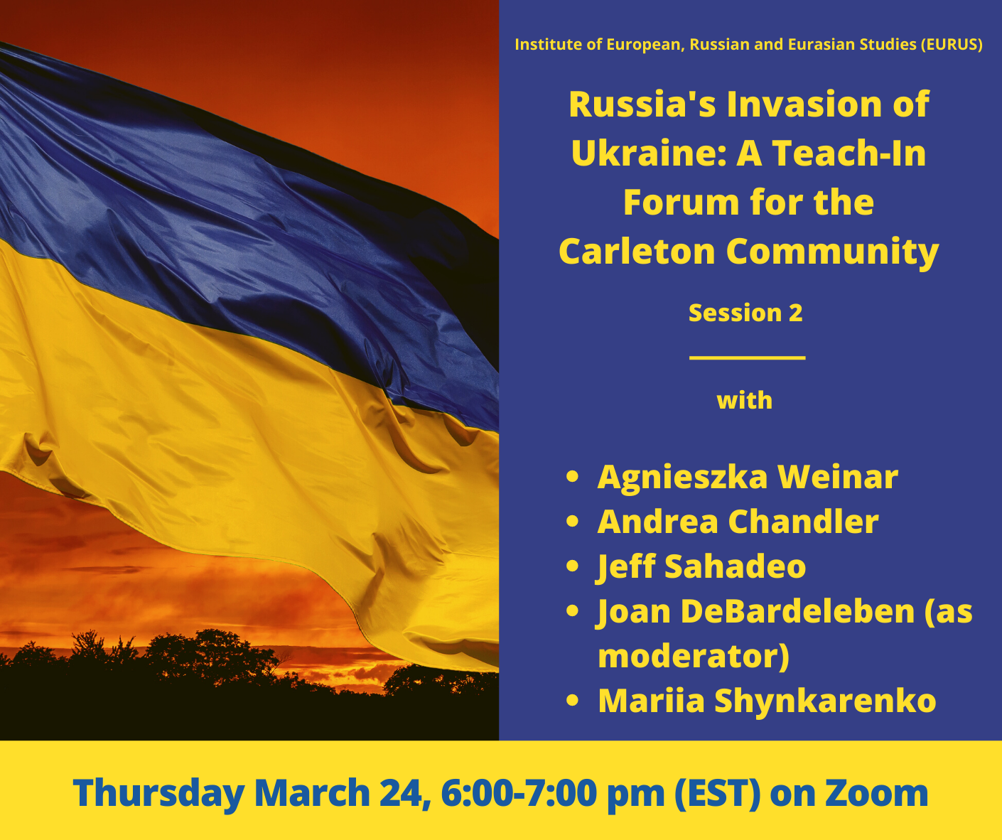 The Institute of European, Russian and Eurasian Studies (EURUS) announces the second session in our teach-in series on the ongoing war in Ukraine. “Russia’s Invasion of Ukraine: A Teach-In Forum for the Carleton Community” (Session 2) will take place on Thursday March 24 from 6:00-7:00 pm (EST) on Zoom.