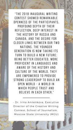 The purpose of the contest is to generate interest among students in appreciation of the relationship between our countries; to celebrate Russian-Canadian heritage and the diversity of cultures and languages in Canada; and to provide an opportunity for students to showcase their knowledge of the Russian language, literature and history.