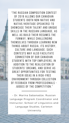 “The Russian Language as a Window into Russian Culture” – This category is open to all students from Canadian schools and universities, language schools and Russian learning centers, who are studying the Russian language and who are not native Russian speakers. There is no limit on the age of contestants or the duration of time learning Russian.