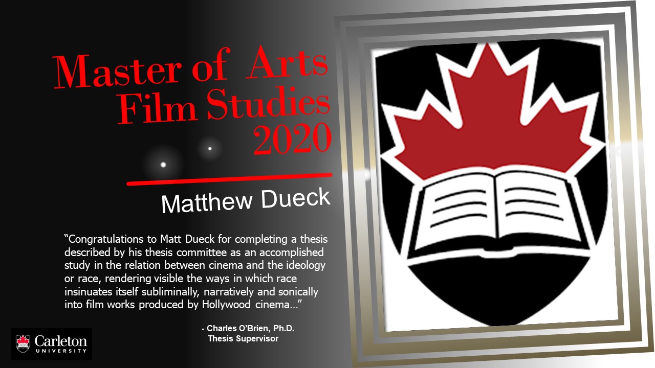 To our 2020-2021 graduates, we tip our hats to you on the occasion of your graduation. This is a special time. You have worked hard to earn your degree and now is the moment when your professors, your family, and your friends pause to celebrate your achievement. We are honoured that you chose Film Studies as your intellectual home at Carleton. We hope that over your time learning with us you have come to gain a wider and richer understanding of the world through its diverse cinemas. We all share a love of film in this small community, but it is a love that serves a wider purpose and project: to be constantly curious and to never stop learning. Congratulations!