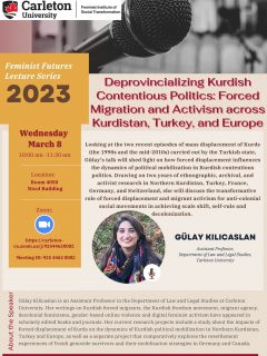 This IWD, the Feminist Futures Lecture Series (hosted by FIST) is excited to present a presentation by Dr. Gülay Kilicaslan titled: ‘Deprovincializing Kurdish Contentious Politics: Forced Migration and Activism across Kurdistan, Turkey, and Europe.’ Dr. Kilicaslan will discuss the two recent episodes of mass displacement of Kurds (the 1990s and the mid-2010s) carried out by the Turkish state, to shed light on how forced displacement influences the dynamics of political mobilization in Kurdish contentious politics. Dr. Kilicaslan’s research reveals the transformative role of forced displacement and migrant activism for anti-colonial social movements in achieving scale shift, self-rule, and decolonization.