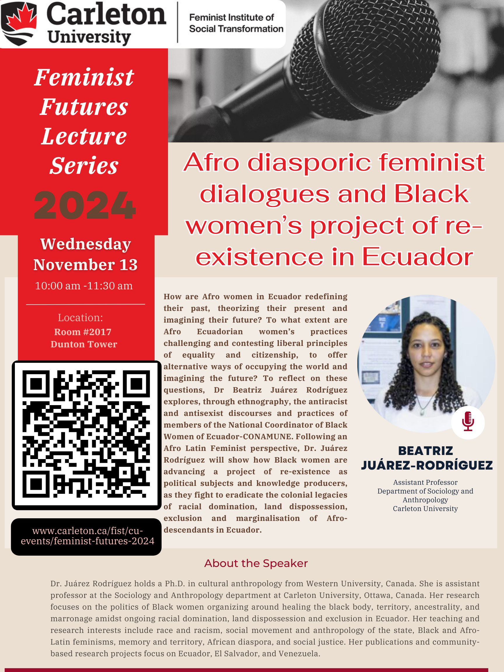 The Feminist Institute of Social Transformation is thrilled to present Afro Diasporic Feminist Dialogues and Black Women’s Project of Re-existence in Ecuador, an insightful presentation by Dr. Beatriz Juárez-Rodríguez as part of our Feminist Futures Speaker Series. This event will delve into powerful themes of resistance, identity, and cultural resilience, spotlighting the work of Black women in Ecuador as they engage in transformative practices of re-existence.