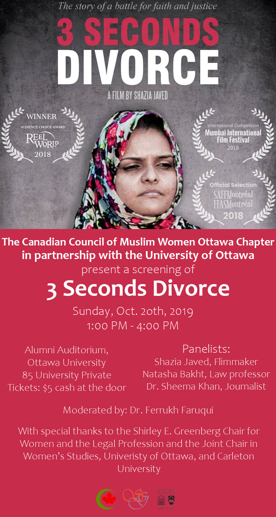 The Canadian Council of Muslim Women, Ottawa chapter will be screening this critically acclaimed documentary on the controversial practice of triple divorce. The film examines the devastating effects of this practice on Muslim women in India, and their efforts to have this law repealed.