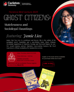 The Feminist Institute of Social Transformation at Carleton University is excited to host the 2025 Florence Bird Lecture on Thursday, March 20, 2025, from 10:00 AM to 1:00 PM at Carleton University. This year’s distinguished speaker is Jamie Liew, a professor, lawyer, and author, whose work critically examines migration, citizenship, and statelessness. Her lecture, Ghost Citizens: Statelessness and Sociolegal Hauntings, will explore how colonial legacies and legal frameworks render individuals invisible in the eyes of the state.