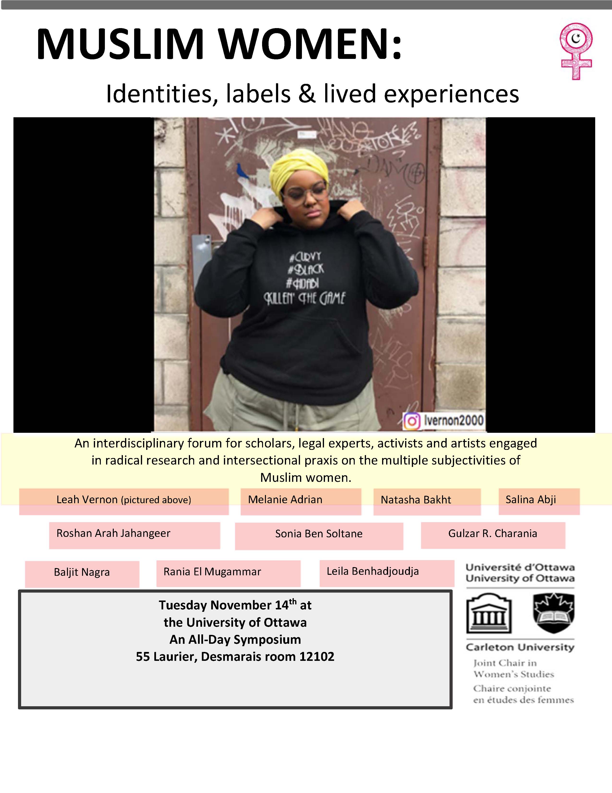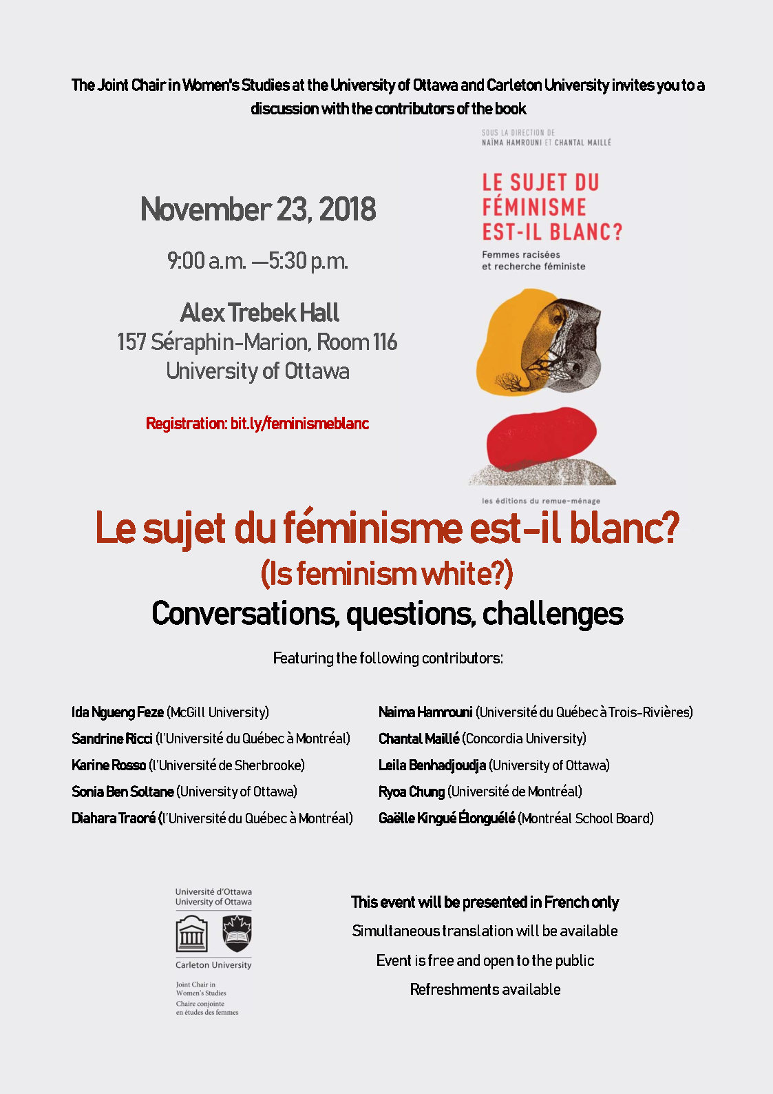 Speakers: Greta Hofmann Nemiroff, former Joint Chair in Women’s Studies at Carleton University and the University of Ottawa; Mythili Rajiva, Alexandre Baril, and Hayley Crooks, University of Ottawa; Lara Karaian, Carleton University; Mary Bunch, McGill University; Djenabou Sangaré, Réseau d’action pour l’égalité des femmes immigrées et racisées du Québec (RAFIQ); Readings of creative writings on the body performed by graduate students of the Pauline Jewett Institute of Women’s and Gender Studies, Carleton University, with novelist Michèle Vinet