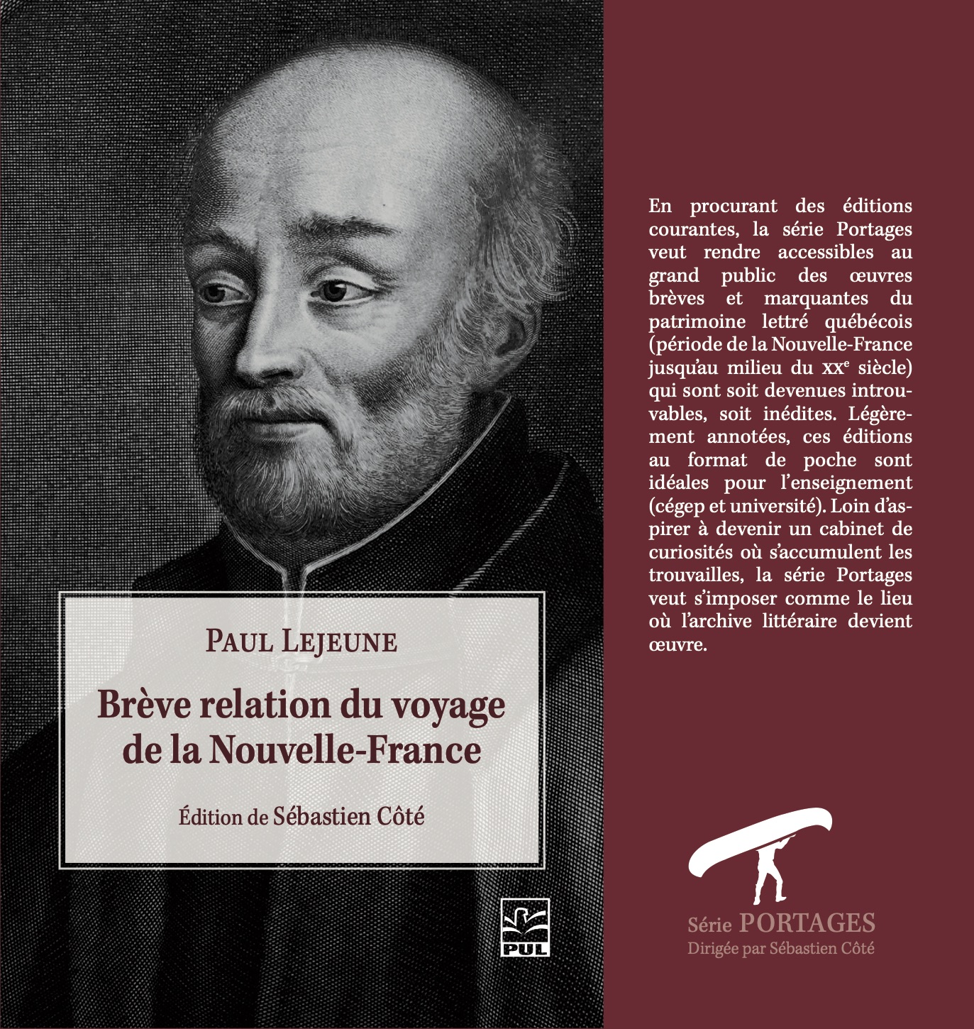 Paul Lejeune. Brève relation du voyage de la Nouvelle-France. Edited and introduced by Sébastien Côté, annotated with the collaboration of Réal Ouellet. Second, revised edition in Quebec City: Presses de l’Université Laval (series “L’Archive littéraire au Québec: Portages”), 2020, 77 p.
