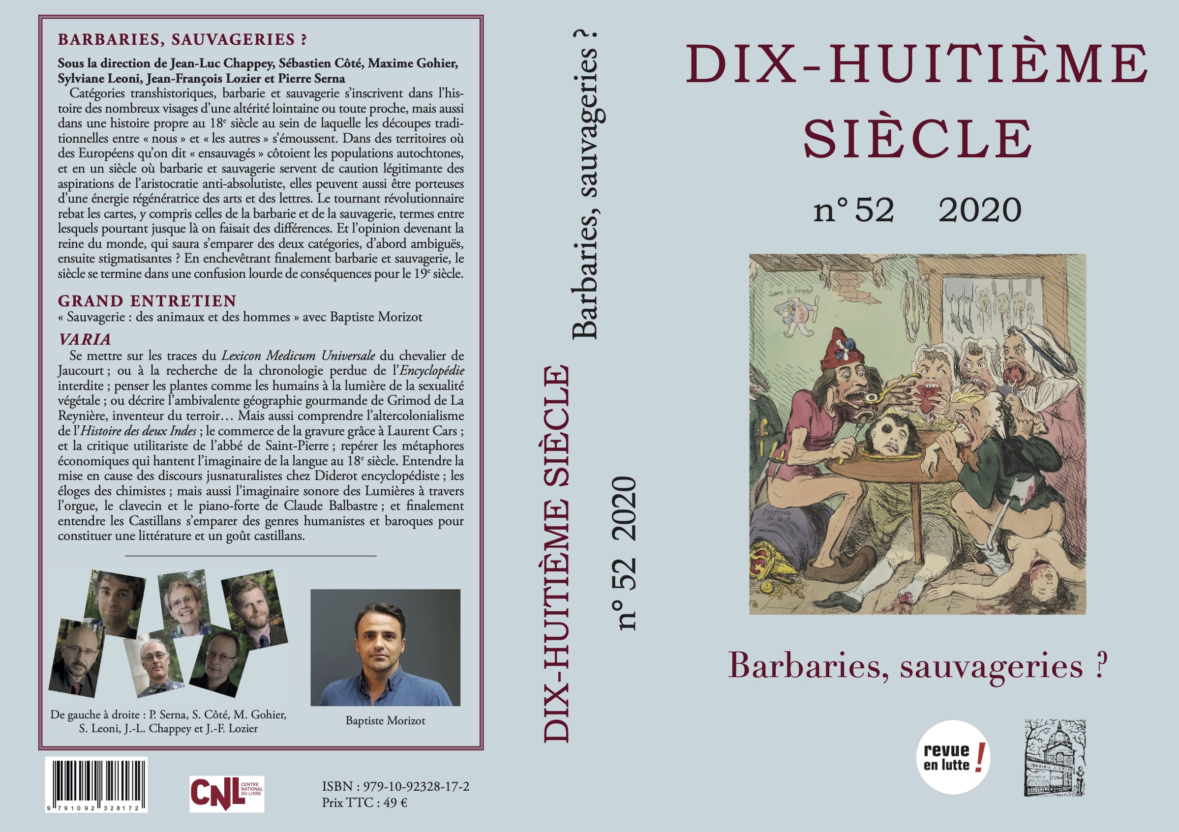 Barbaries, sauvageries ? Eds. Jean-Luc Chappey, Sébastien Côté, Maxime Gohier, Sylviane Leoni, Jean-François Lozier and Pierre Serna. Dix-huitième siècle (Paris), n° 52, 2020 : 13-256.