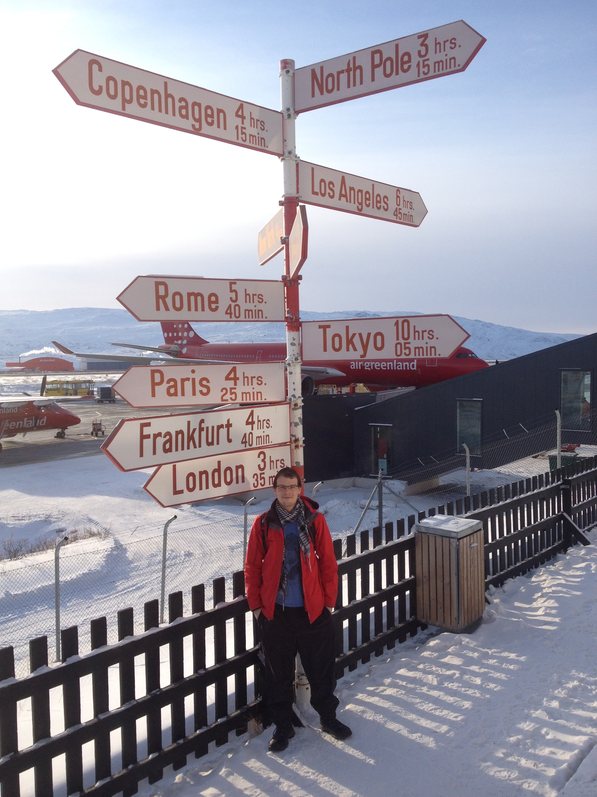 Though we’ve been travelling for hours, our excitement is palpable when we step onto the tarmac of Kangerlussuaq airport. It is my first time standing north of the Arctic Circle, and I am glad that we get to walk outside when changing aircraft.