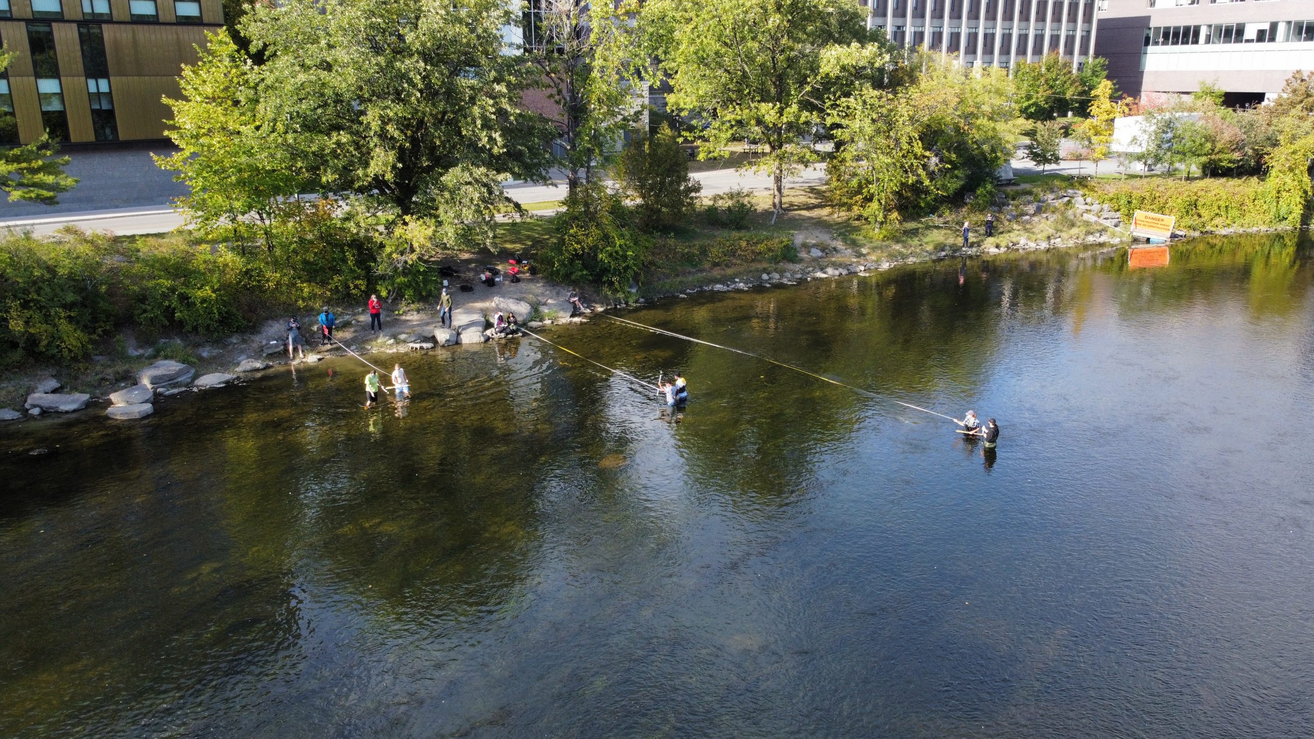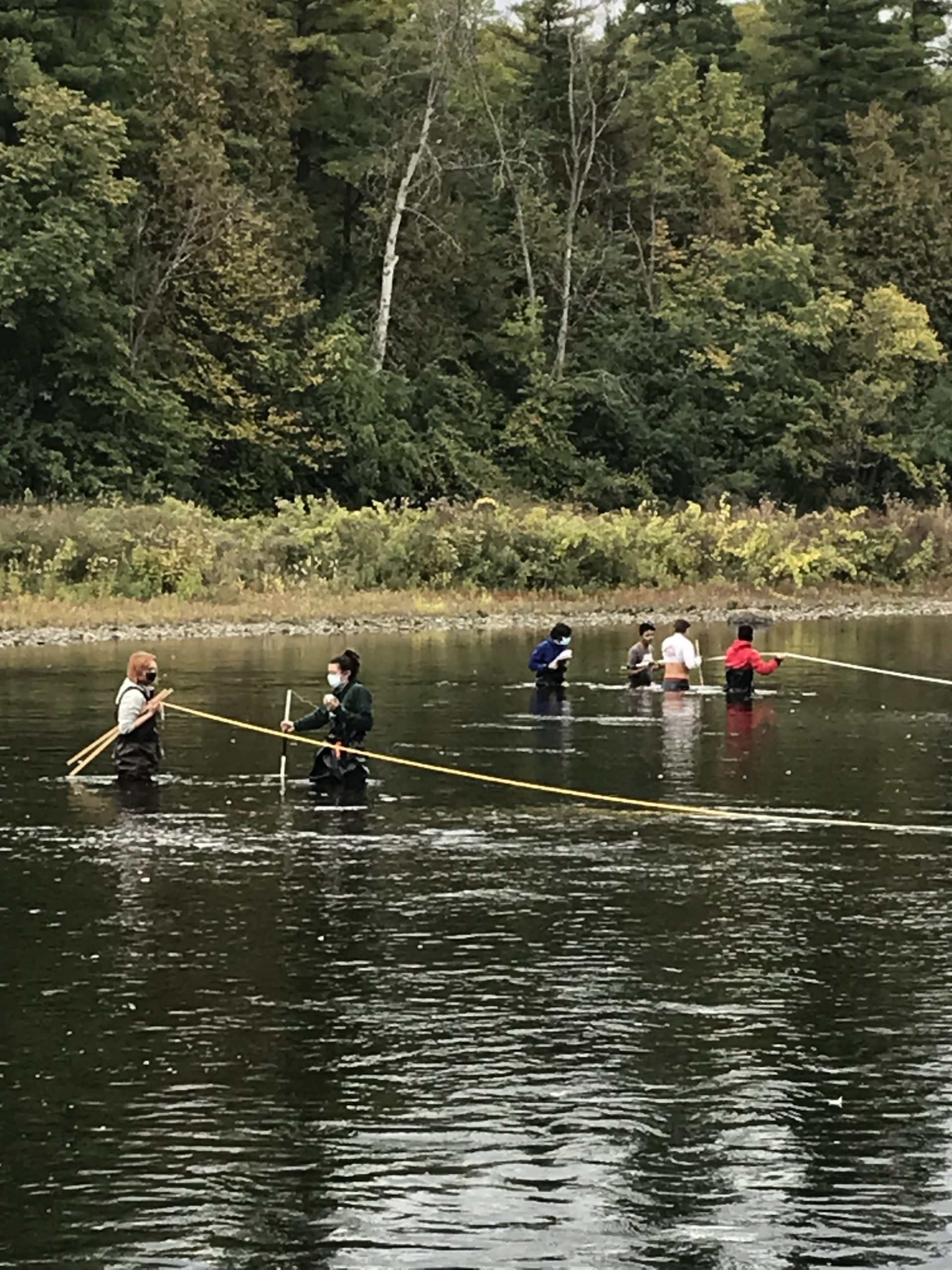 Dr. Jennifer Totten, course instructor, explains, “Students are learning to acquire stream-flow data by hands-on measurement in the Rideau. They also get to compare their data with the real-time data simultaneously obtained by the Environment Canada recording station (in the concrete bunker just above the rapids!). They have a chance to see the variation of current with depth and width as they work their way across the channel just above the rapids. They get the chance to find out what the challenges are in collecting actual stream data (weeds, deep spots, slippery rocks, wind, changing places & maintaining their profile, long tape measures that break, and of course, leaky hip waders!). They learn to work together for safety & efficiency and have fun playing in the water on a really nice day! We are so lucky to have a wade-able river right on campus!”.