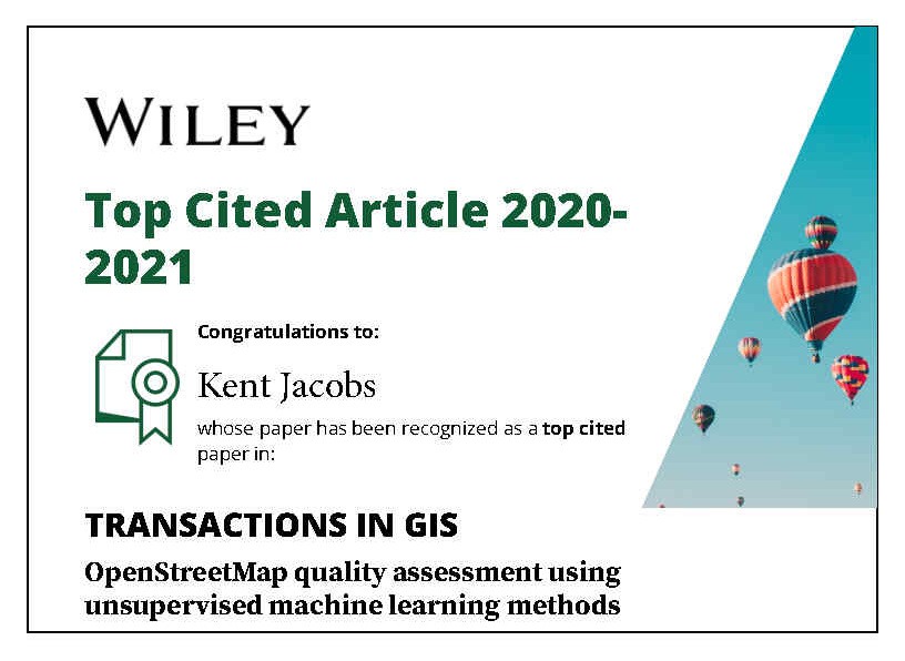 Congratulations alumnus Kent Jacobs whose paper has been recognized as a top cited paper. The paper is titled OpenStreetMap quality assessment using unsupervised machine learning methods.