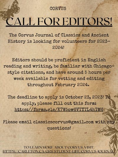 Corvus, now in its thirteenth year of publication, is an undergraduate level journal that allows students to come together to produce a highly professional undergraduate journal. Being completely student run, funded, edited, and overseen, the journal of the Carleton University Classics Society strives to improve with each passing year, while continuing to offer new insight into the realm of the Classics.