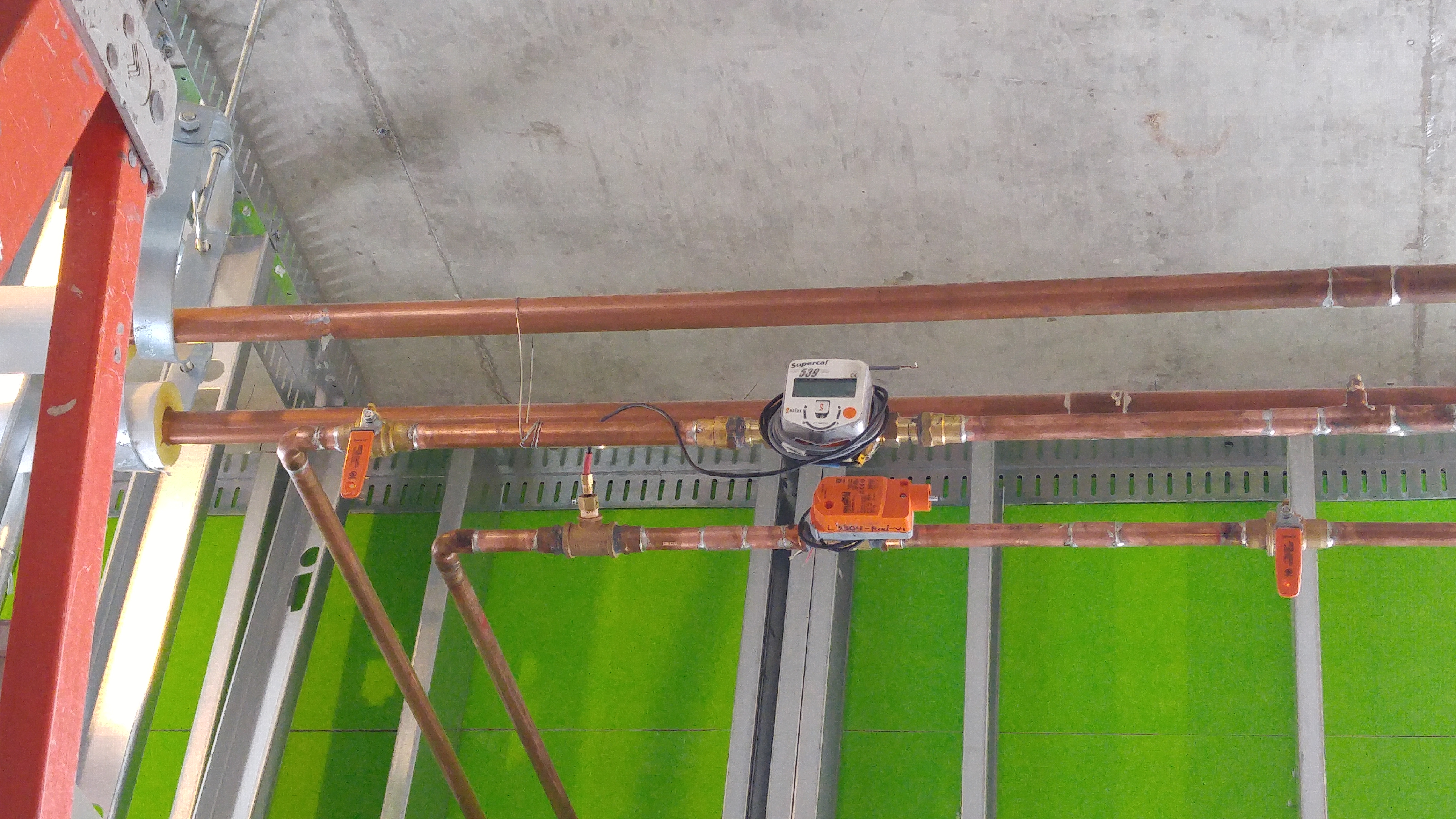 Flow meter for measuring heating fluid flow rate and delta temperature, from which heat input rate can be derived. About 40 flow rate meters are installed to measure the heating input in 27 offices.