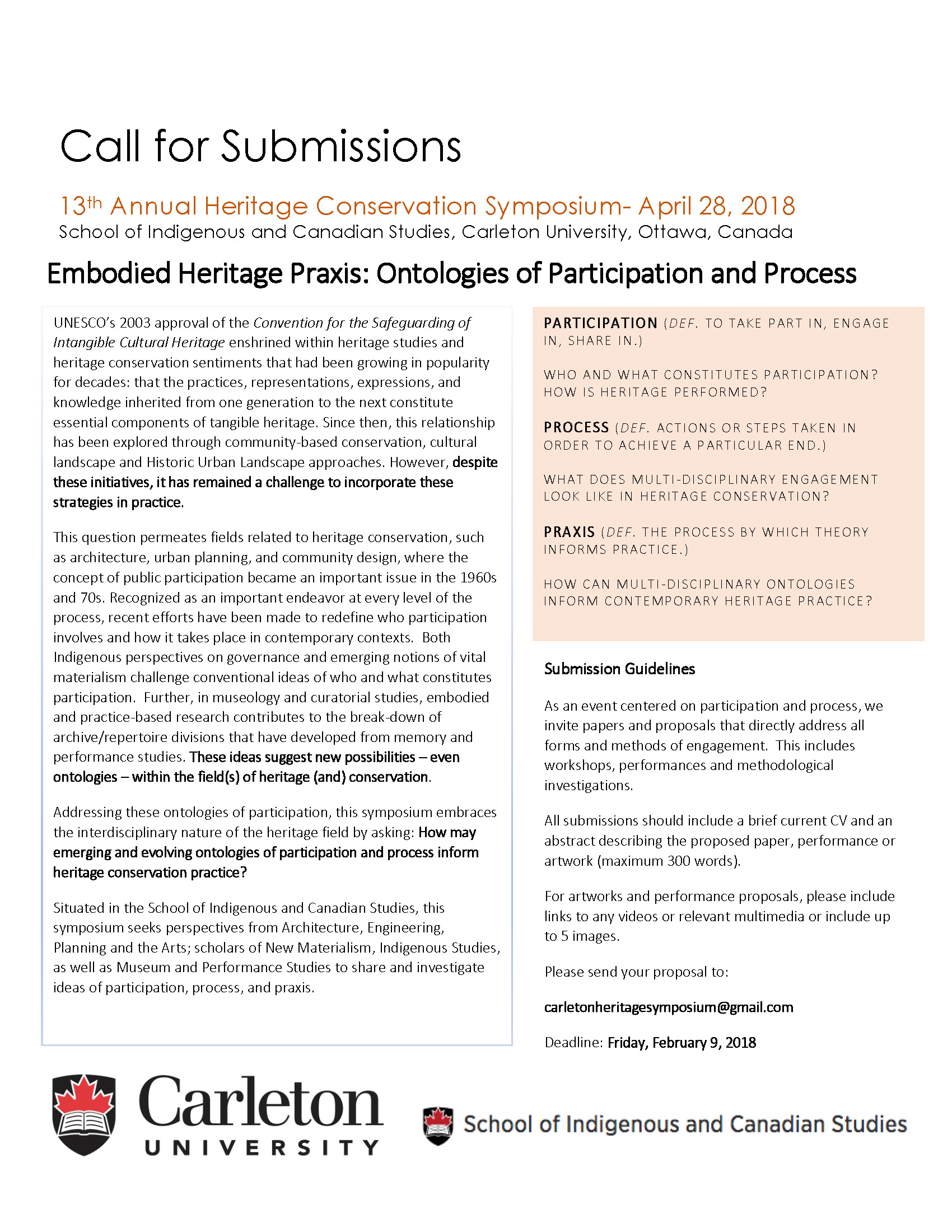 Addressing these ontologies of participation, this symposium embraces the interdisciplinary nature of the heritage field by asking: How may emerging and evolving ontologies of participation and process inform heritage conservation practice? Situated in the School of Indigenous and Canadian Studies, this symposium seeks perspectives from Architecture, Engineering, Planning and the Arts; scholars of New Materialism, Indigenous Studies, as well as Museum and Performance Studies to share and investigate ideas of participation, process, and praxis.