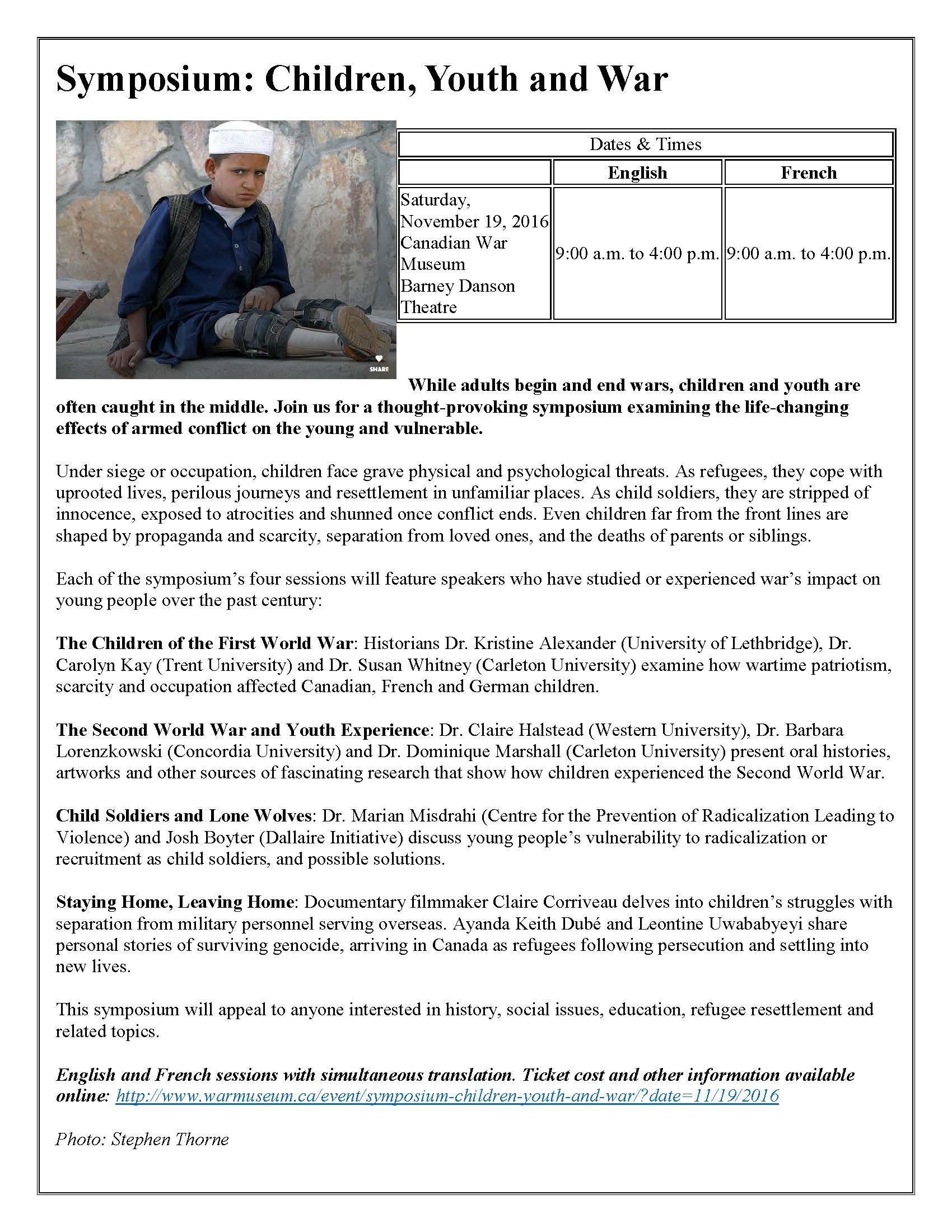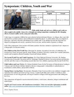History Professors Dominique Marshall and Susan Whitney will be speaking at the upcoming Symposium: Children, Youth and War at the Canadian War Museum.