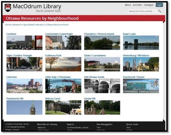 Housed on the Library’s first floor, the Ottawa Resource Room also has a strong presence on the internet. Visitors to the website will note that the collection is curated visually according to neighbourhood—offering visitors a strong cue of the collection’s focus on enabling local stories.