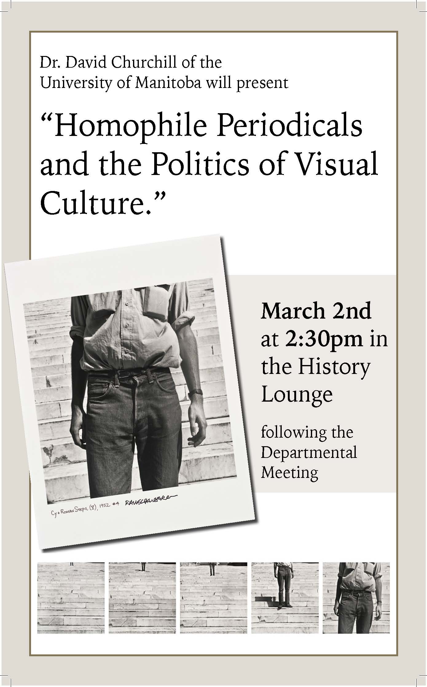 Join us on March 2nd at 2:30pm in room 433 Paterson as Dr. David Churchill of the University of Manitoba presents “Homophile Periodicals and the Politics of Visual Culture.”