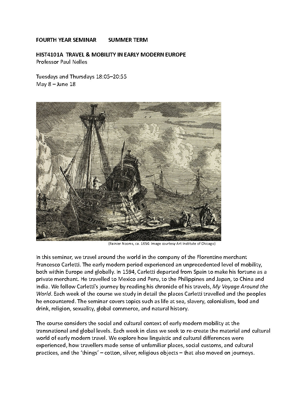 In this seminar, we travel around the world in the company of the Florentine merchant Francesco Carletti. The early modern period experienced an unprecedented level of mobility, both within Europe and globally. In 1594, Carletti departed from Spain to make his fortune as a private merchant. He travelled to Mexico and Peru, to the Philippines and Japan, to China and India. We follow Carletti’s journey by reading his chronicle of his travels, My Voyage Around the World. Each week of the course we study in detail the places Carletti travelled and the peoples he encountered. The seminar covers topics such as life at sea, slavery, colonialism, food and drink, religion, sexuality, global commerce, and natural history.