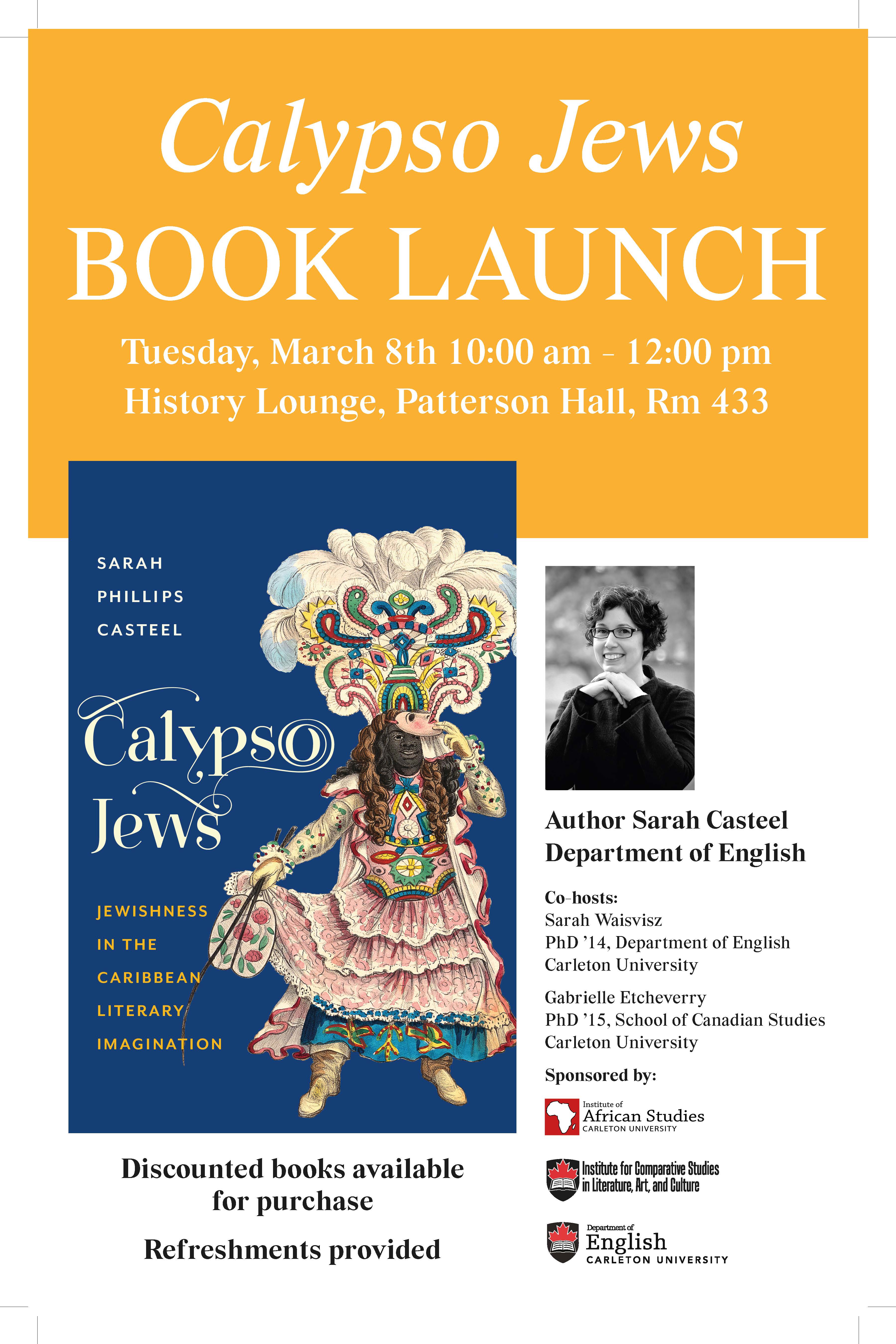 Please join us on March 8th, 2016 from 10:00 am to 12:00 pm (History Lounge, Room 433, Paterson Hall) at a Book Launch for Dr. Sarah Phillips-Casteel’s recent book Calypso Jews: Jewishness in the Caribbean Literary Imagination published by Columbia University Press. ICSLAC is pleased to partner with the Institute of African Studies and the Department of English for this event.