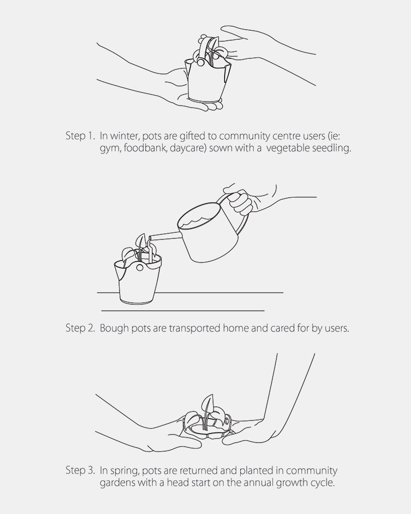 Industrial designer Jacob Boyd presents Bough Pot, a biodegradable plant vessel that connects community center users and urban farming initiatives. Designed in collaboration with Carleton University and a local community center, the pot is made from materials like recycled pulp, bound with rice paste, and it’s produced in the centers themselves using 3D printed compression molds. Since the Bough Pots are fully decomposable, vegetables can be planted directly in the soil without removing the plant from the vessel, simplifying the planting process and reducing waste.