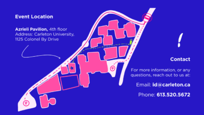 RE:DESIGN will be held on the 4th floor of the Azrieli Pavilion at Carleton University, located facing Library Rd between Dunton Tower and the Tory Building. The address is 1125 Colonel By Drive, Ottawa. The nearest parking lot is P1 (behind MacOdrum Library). |