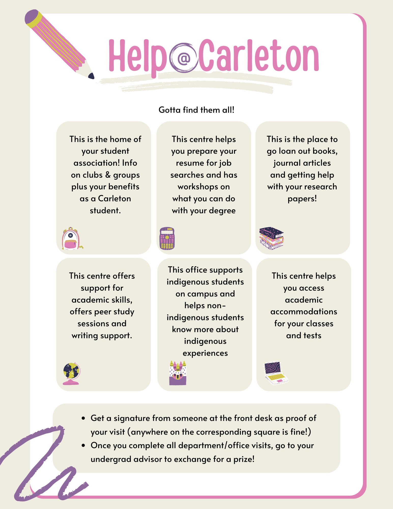 Are you ready for an adventure around campus? Grab your scavenger hunt sheet here (available for download or from the IIS undergraduate administrator office) and embark on a quest to discover essential student resources and support offices @ Carleton. Each clue will lead you to a different spot where you’ll collect signatures from friendly staff members.