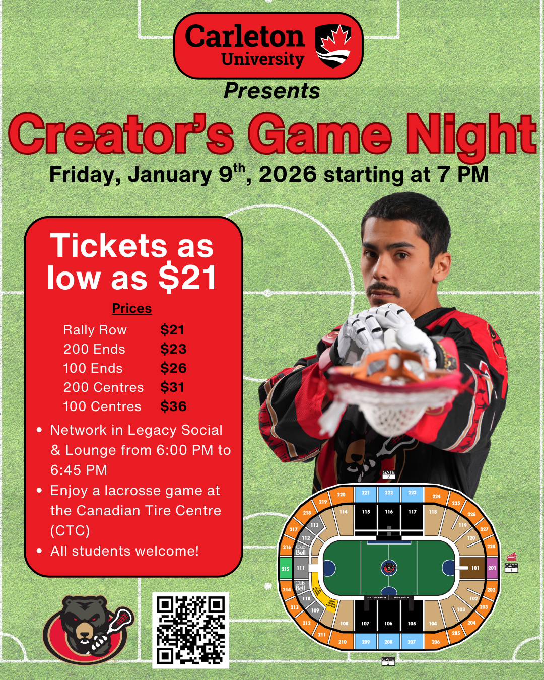 Past Event! Note: this event has already taken place.Creator’s Game Night: Ottawa Black Bears vs. Halifax ThunderbirdsJanuary 9, 2026 at 7:00 PMLocation:Canadian Tire Centre - 1000 Palladium DriveCost:Starting at $21 Share: Twitter, Facebook Short URL: https://carleton.ca/indigenous/cisce/?p=4154