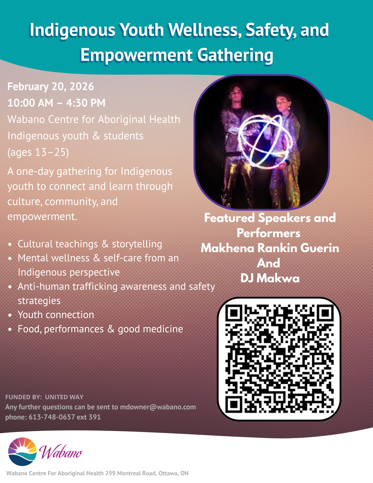 This free gathering is designed for Indigenous youth and students ages 13–25 and focuses on mental wellness, cultural identity, anti-human trafficking, and connection. The day will provide a culturally grounded and supportive space for youth to learn and build community alongside peers from across Ottawa.