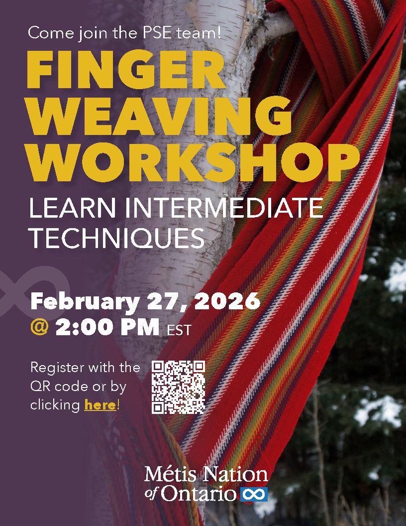 Join the MNO Post-Secondary Education team for a Virtual Finger Weaving Workshop on February 27th at 2:00 pm EST. Participants will explore the cultural importance of finger weaving and learn intermediate-level techniques. Some prior finger-weaving experience is recommended. Space is limited and available on a first-come, first-served basis. A supply list will be emailed after registration.