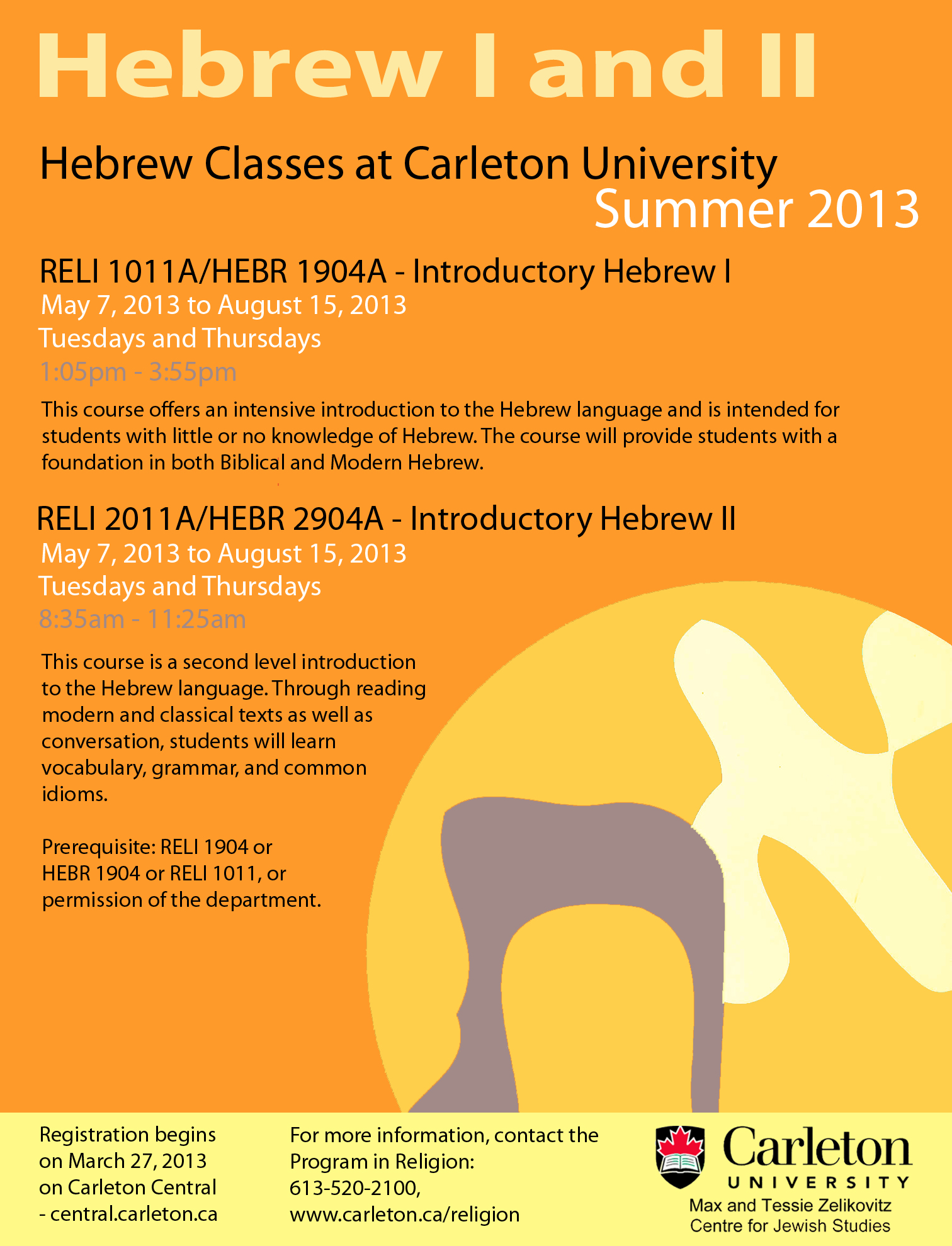 http://carleton.ca/jewishstudies/summer-hebrew-courses-2013/ Thursday, April 11, 2013 | Categories: Uncategorized Share: Twitter, Facebook Short URL: https://carleton.ca/jewishstudies/?p=1741