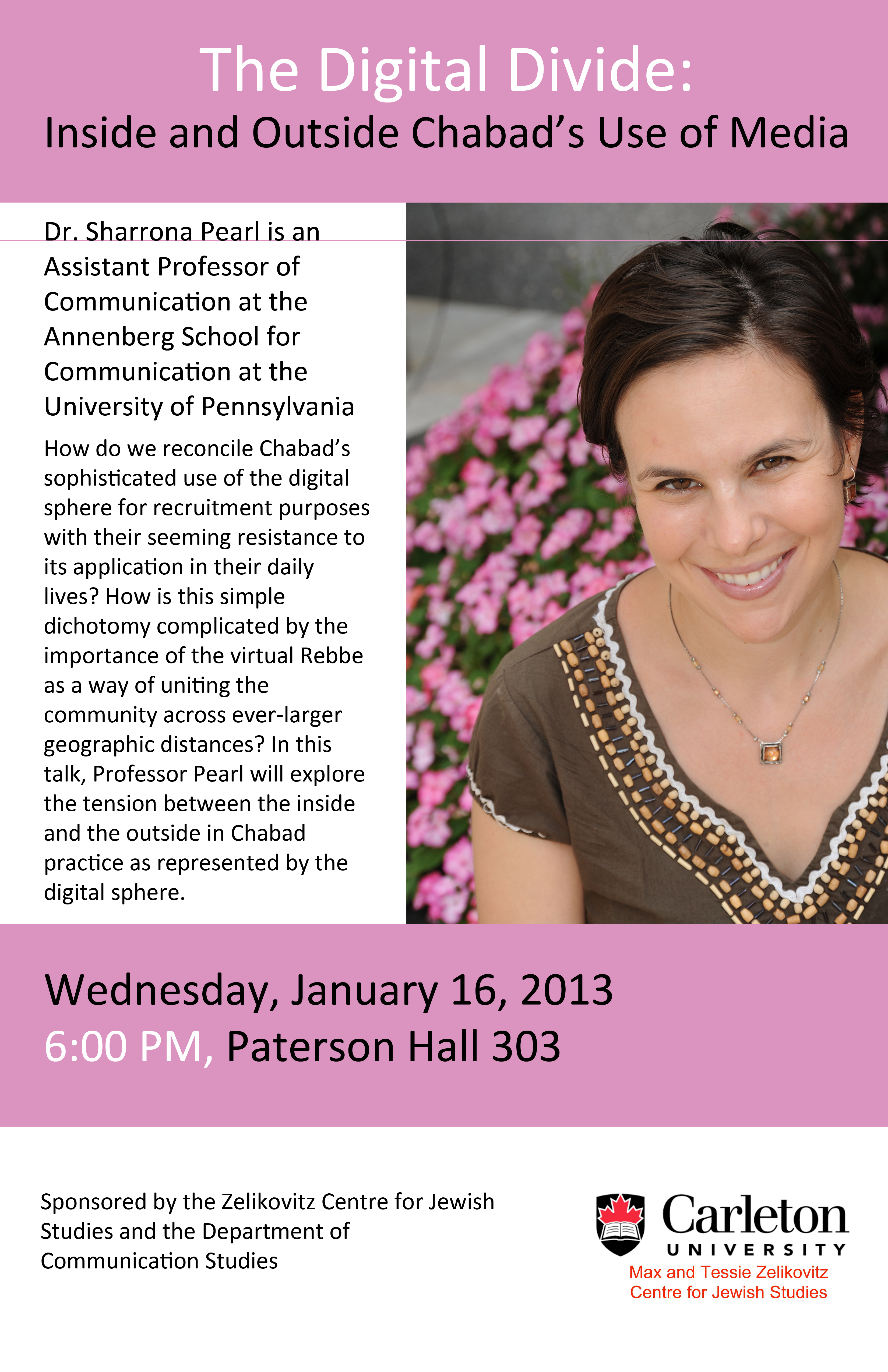 Prof. Sharrona Pearl from the University of Pennsylvania will be speaking at Carleton University on “The Digital Divide: Inside and Outside Chabad’s Use of Media” the evening of Jan 16th.