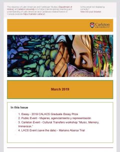 Latin American and Caribbean at Carleton Studies Bulletin – March 2019 Link: LACS Bulletin March 2019 In this Issue: Essay – 2019 CALACS Graduate Essay Prize Public Event – Mujeres, agenciamiento y representación Carleton Event – Cultural Transfers workshop “Music, Memory, Immersion.” LACS Event (save the date) – Mariano Abarca Trial Wednesday, March 6, 2019 | Categories: Bulletins