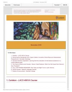 Latin American and Caribbean at Carleton Studies Bulletin – NOVEMBER 2018 Link: LACS Bulletin November 2018 In this Issue: Carleton – LACS 4001A Course Honouring the Scholarship of Dr. Agnes Calliste: Innovative Critical Race and Intersectional Perspectives in Canadian Sociology Canada-Colombia cooperation: Learning from the evaluation of international assistance in a conflict-affected state The Future of Mexico and Canada – Mexico Trade Relations: What Can We Expect from Mexico’s New President? CALL FOR PAPERS REMINDER- Pink Tides and Right Turns in Latin America UNAM-Canadá – Spanish Language Courses Position Announcement – Bowdoin College Monday, January 28, 2019 | Categories: Bulletins
