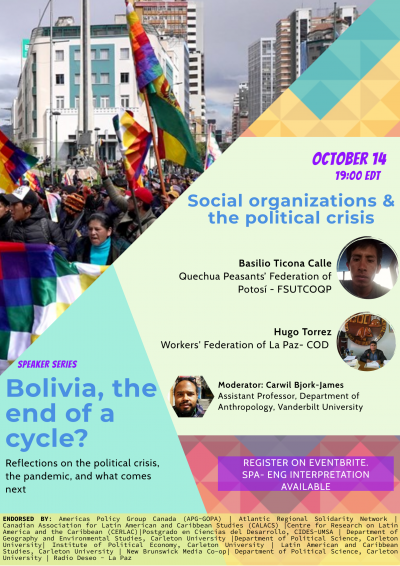 Sponsored by: Americas Policy Group Canada (APG-GOPA) | Atlantic Regional Solidarity Network | Canadian Association for Latin American and Caribbean Studies (CALACS) |Centre for Research on Latin America and the Caribbean (CERLAC)| Postgrado en Ciencias del Desarrollo, CIDES-UMSA | Department of Geography and Environmental Studies, Carleton University |Department of Political Science, Carleton University| Institute of Political Economy, Carleton University | Latin American and Caribbean Studies, Carleton University | New Brunswick Media Co-op| Department of Political Science, Carleton University | Radio Deseo – La Paz