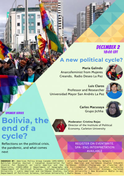 Sponsored by: Americas Policy Group Canada (APG-GOPA) | Atlantic Regional Solidarity Network | Bolivian Studies Journal | Canadian Association for Latin American and Caribbean Studies (CALACS) |Centre for Research on Latin America and the Caribbean (CERLAC)| Postgrado en Ciencias del Desarrollo, CIDES-UMSA | Department of Geography and Environmental Studies, Carleton University |Department of Political Science, Carleton University| Institute of Political Economy, Carleton University | Latin American and Caribbean Studies, Carleton University | New Brunswick Media Co-op| Department of Political Science, Carleton University | Radio Deseo – La Paz