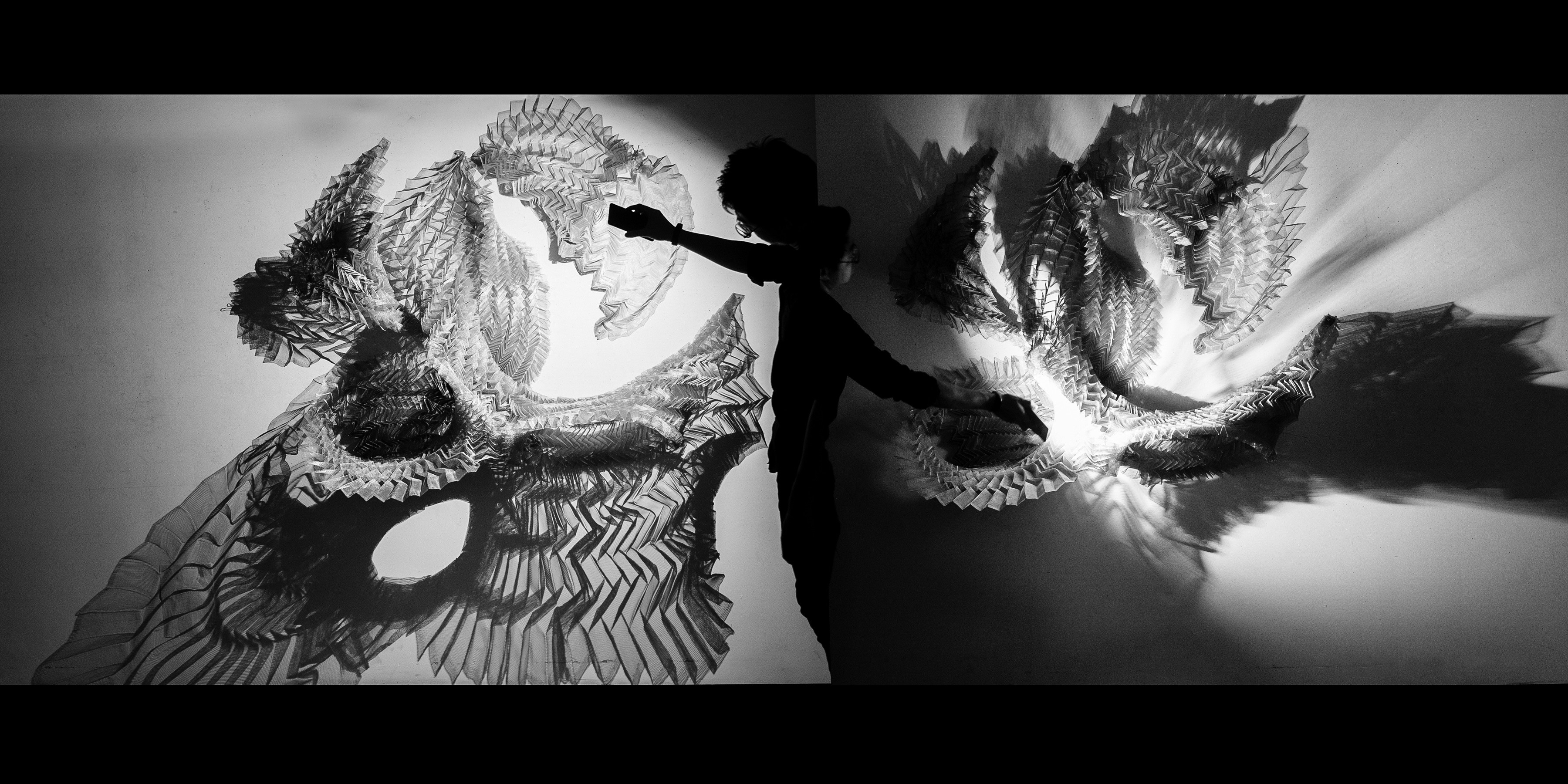 The installation is the recent work by students in the Crossings Interdisciplinary Workshop, offered by Prof. Manuel Báez in the Fall term of 2018 at the Azrieli School of Architecture and Urbanism. By working with aluminum mesh that’s been folded into a very fluidly malleable pattern, students were encouraged to experientially explore and improvise through these dynamic shape-shifting properties and their projected shadows while drawing inspiration from Leonardo’s speculations and studies.