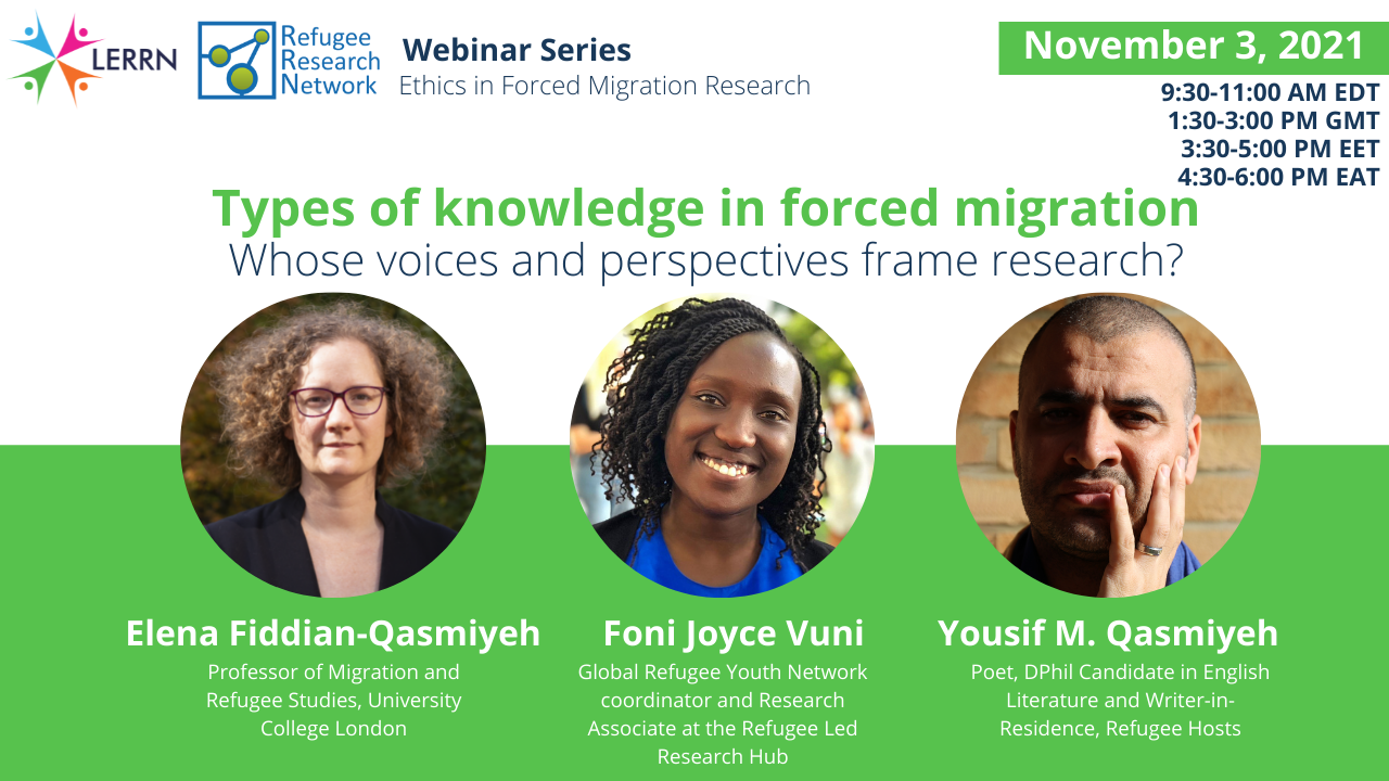 The first webinar in LERRN’s Ethics in Forced Migration Research series, co-hosted with the Refugee Research Network, attracted 82 participants from 20 countries. While later webinars in the series will look at more specific aspects of the research process, the first webinar started with the important question of what knowledge and whose knowledge is valued in research and in policy processes. The webinar featured three speakers: Yousif M. Qasmiyeh (Poet, DPhil Candidate in English Literature, and Writer-in-Residence with the Refugee Hosts project), Foni Joyce Vuni (Global Refugee Youth Network coordinator and Research Associate at the Refugee Led Research Hub), and Elena Fiddian-Qasmiyeh (Professor of Migration and Refugee Studies, University College London).