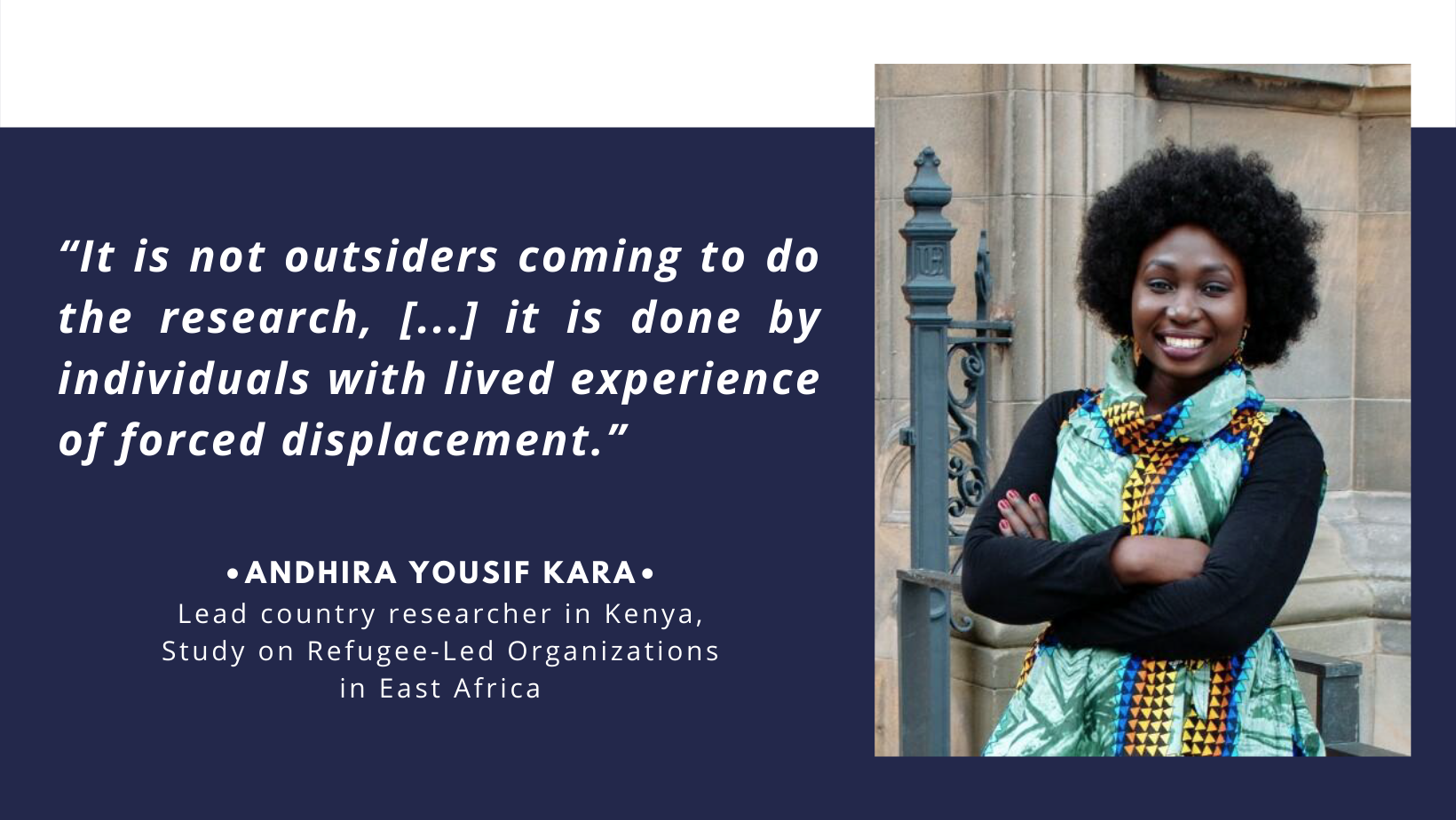 Andhira is from South Sudan, but lives in Kenya as a refugee. She spoke about the different outcomes from refugee participation in research, as refugees bring different understanding of the context of the research. As the lead researcher in Kenya, Andhira said is it important that refugees are leading the research that goes on to inform policy and practices: “It is not outsiders coming to do the research, […] it is done by individuals with lived experience of forced displacement.”