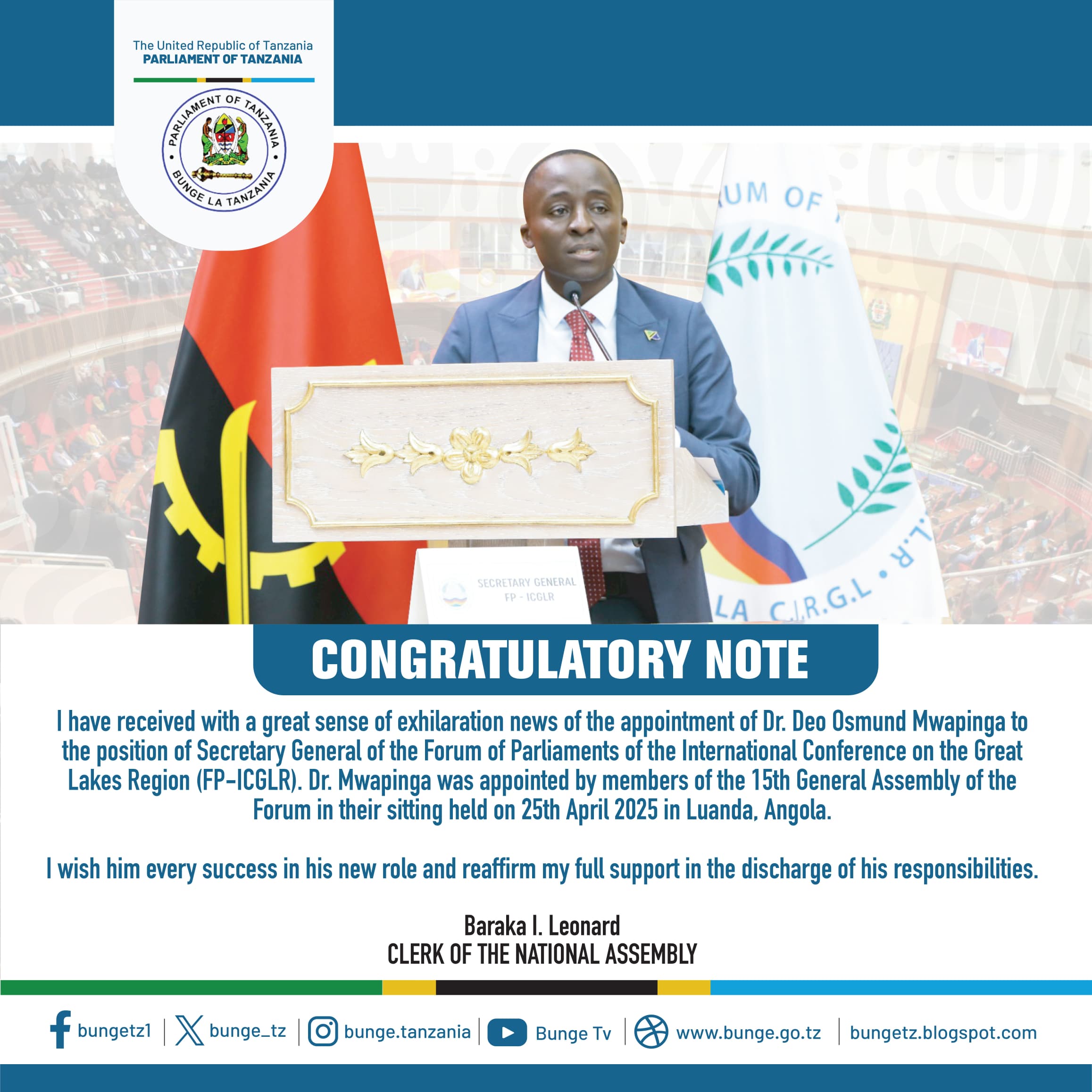 The Parliament of Tanzania and LERRN proudly congratulate Dr. Deo Osmund Mwapingwa on his appointment as Secretary General of the Forum of Parliaments of the International Conference on the Great Lakes Region (FP-ICGLR). His appointment was confirmed during the 15th General Assembly held on April 25, 2025, in Luanda, Angola.