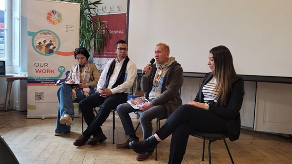 Panel: “Venezuelan refugees in Latin America: protection gaps” during the Global Refugee Forum 2023. In the photo: Fernanda Bedoya (El Derecho a No Obedecer), Roberto Blanco (Alianza VenCR), Robert Tigrera (Asociación Lluvia de Arcoiris), Lublanc Prieto (Refugees United)